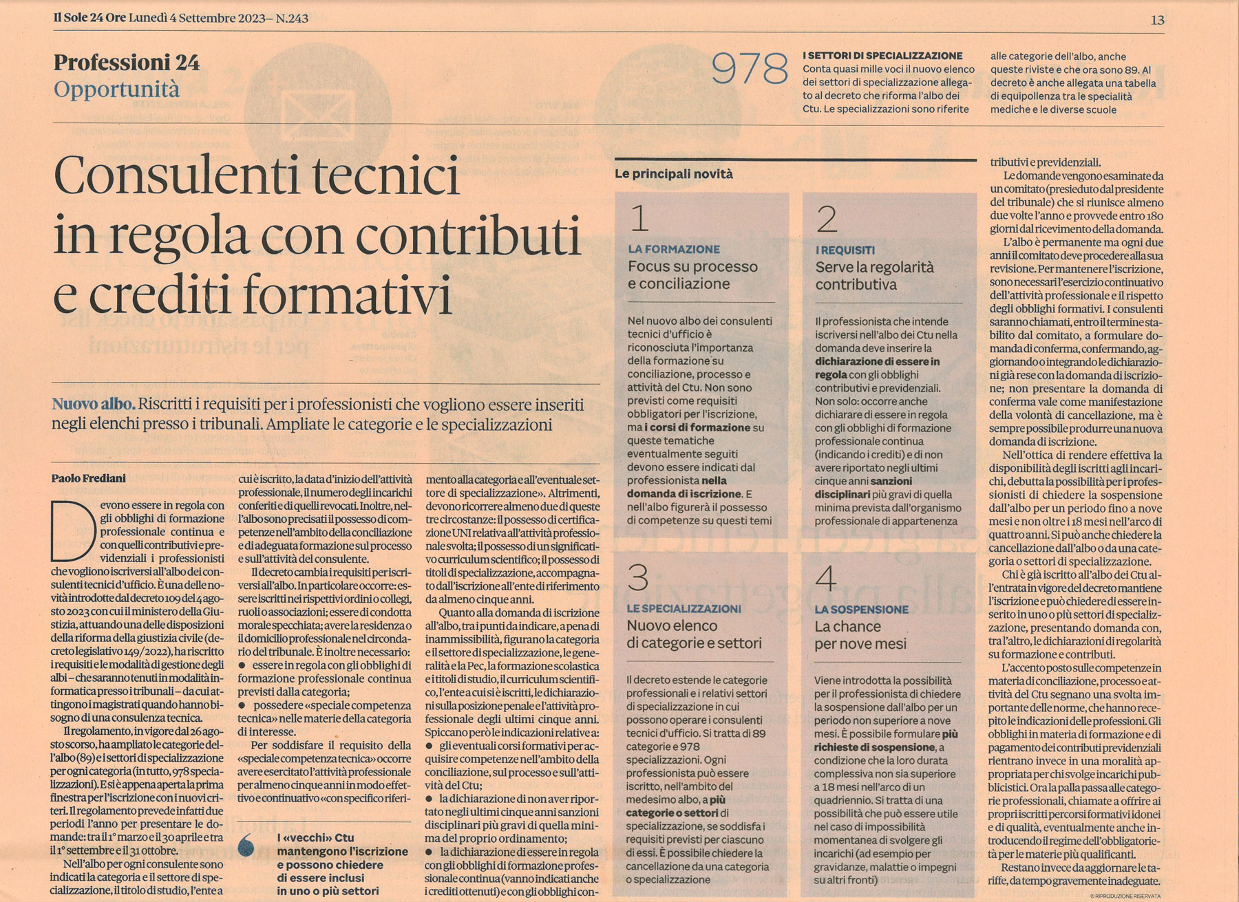Approfondimenti sulla riforma del processo per i CTU. Pubblicazione articolo su Il Sole 24 ore